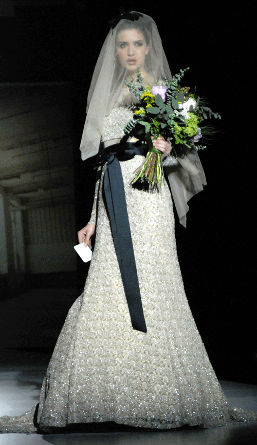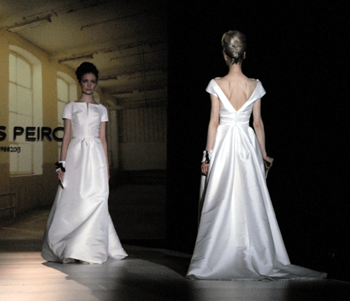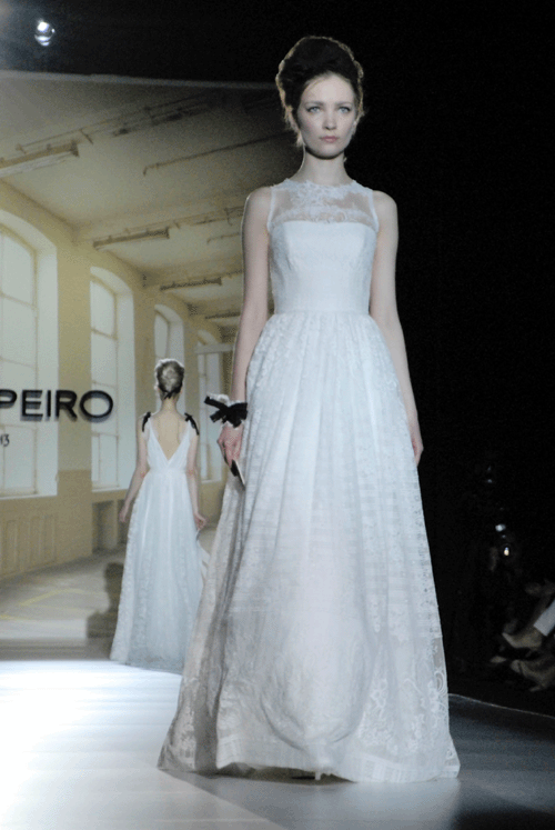 La firma presentó hasta 36 modelos de su nueva colección. En cada uno de ellos se pudieron presentar guiños a la costura y al taller de novia tradicional, en forma de ribetes y lacitos de color negro, que enmarcan hombros, escote y hasta el peinado que llevaban las modelos a lo Brigitte Bardot. Unos lazos que se inspiran en la cinta negra que estructura las proporciones de los maniquíes.
