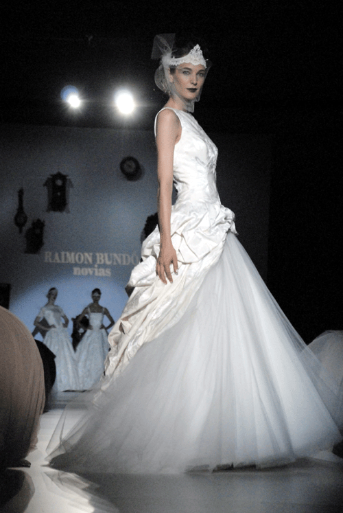 La nueva línea de Raimon Bundó, bajo el título Tiempo Infinito, sorprende por su equilibrio entre elegancia y modernidad. En esta colección han predominado los brocados de seda y algodón de dibujos abstractos y también los tules y sedas. Todos ellos en una amplia gama de colores blancos y marfiles.