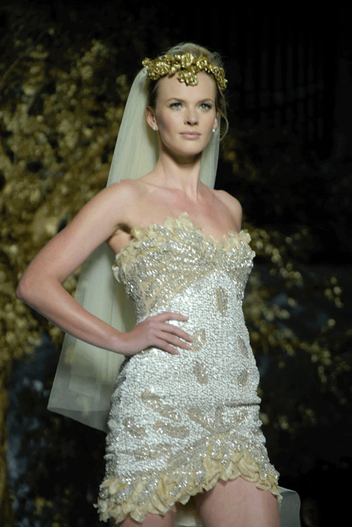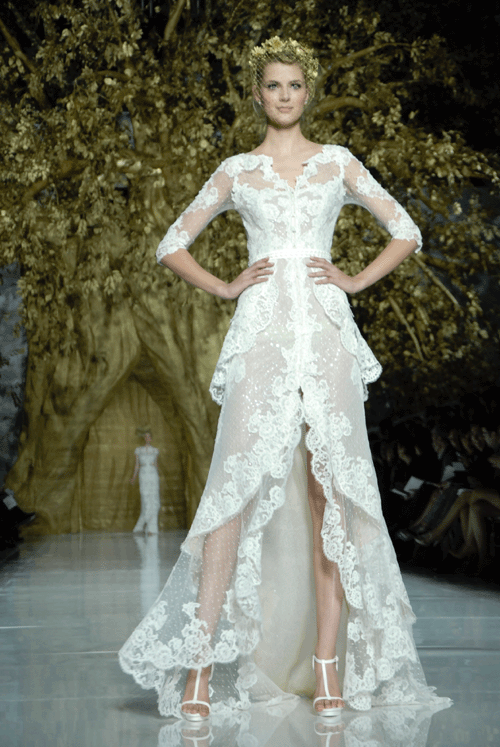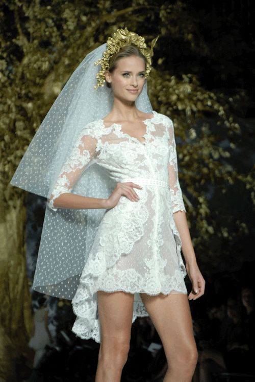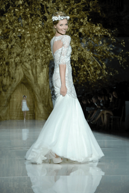 Un desfile que tuvo lugar bajo una puesta en escena impresionante. La firma apuesta por vestidos cortos con pedrería, palabra de honor o de inspiración griega. La nueva colección ofrece una gama amplia de vestidos muy diferentes, para que cada novia pueda encontrar el que encaje mejor con ella. Pronovias sorprende con delicados trabajos de pedrería nacarada y de cristal que van recorriendo la silueta de la mujer.