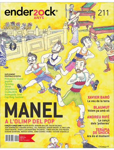 La portada de Enderrock del mes de maig està dedicada a Manel i al seu nou disc, Atletes baixin de l’escenari(Warner/DiscMedi, 2013). La revista ens presenta el grup com mai l’hem vist: a través de la ploma de Pilarín Bayés. La il·lustradora vigatana és la responsable de la portada, on veiem uns Manel atlètics competint «a l’olimp del pop» envoltats d’alguns dels personatges i situacions que apareixen en les cançons del seu nou treball.