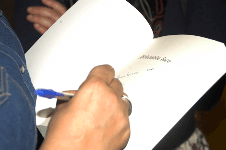 De todo ello nos habla en una entrevista, interrumpida simpáticamente con sus “cómplices” incondicionales, las “Guerreras Maxwell”. De entrada le preguntamos sobre la dedicatoria del libro “a todas las personas que creen en el flechazo”, sobre ello nos dice que “yo creo en el flechazo. Es algo mágico, especial, inexplicable, irracional…. donde seria fantástico que fuera mútuo siempre, pero no es así”.