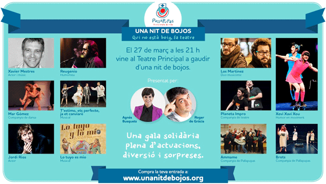Coincidiendo con el Día Internacional del teatro, Pallapupas presenta mañana jueves 27 de marzo la gala solidaria UNA NIT DE BOJOS con actuaciones musicales, humorísticas e intervenciones de los grupos de teatro propios de la ONG. Un acto que resalta la función social de esta disciplina.