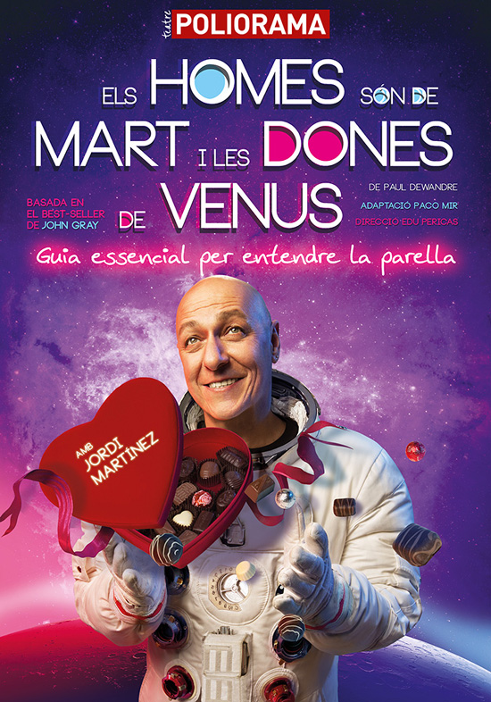 Una bona manera d’esbrinar el misteri va ser amb el best-seller de John Gray “Els homes són de Mart i les dones de Venus”, que van llegir ni més ni menys que 50 milions de persones. Aquest manual instructiu ha agafat forma teatral al Teatre Poliorama, amb l’autor Paul Dewandre, l’adaptació de Paco Mir, la direcció d’Edu Pericas, i el millor dels protagonistes possibles, l’actor Jordi Martínez.