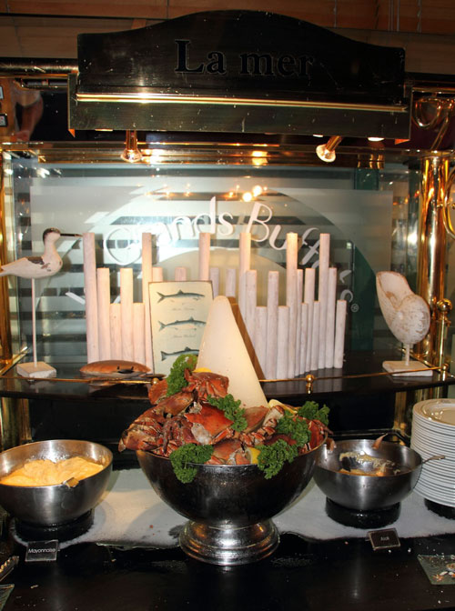 La Mer. Les Grands Buffets ofrece una de las mayores fuentes de marisco que jamás se podrá degustar, tienen como estrella las ostras de Gruissan, además de mejillones, langostinos, bocinas, salmón ahumado y delicatesen especiales con productos del mar.