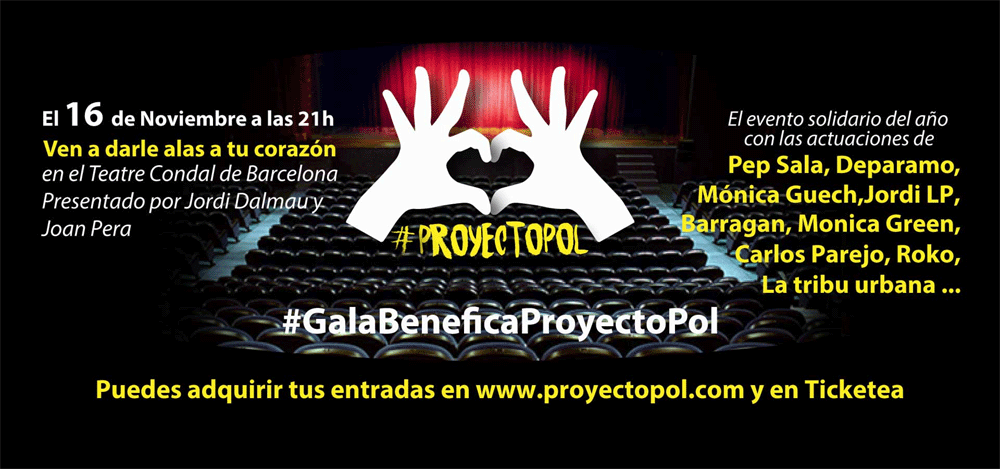 Dilluns 16 de novembre, al Teatre Condal de Barcelona, a les 21 hores, es celebrarà la Gala Benèfica Proyecto Pol, en la que participaran molts artistes, com Mónica Green, Pep Sala, Roko, Carlos Parejo, el pianista De Páramo, el Xef Jordi Cruz, Alberto Cerdán, Jordi LP, Mónica Guech…