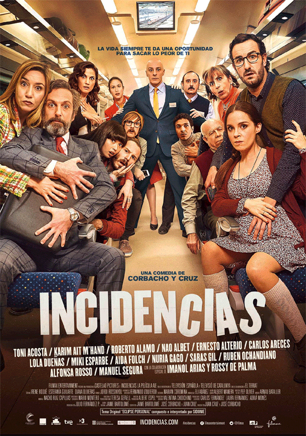 Tota la història d’”Incidencias” es desenvolupa la nit de Cap d’Any, pràcticament en un sol espai, a dalt d’un tren d’alta velocitat on les situacions parteixen de la realitat i fan un gir inesperat cap a la comèdia estripada. La nova pel·lícula dels directors de «Tapas» i «Cobardes» té un cartell ple a vessar de cares conegudes del cinema i la televisió, com Lola Dueñas, Carlos Areces, Ernesto Alterio, Toni Acosta, Núria Gago, Aida Folch, Roberto Álamo, Miki Esparbé i Nao Albet, entre d’altres. A més, hi fan una col·laboració especial Imanol Arias i Rossy de Palma.