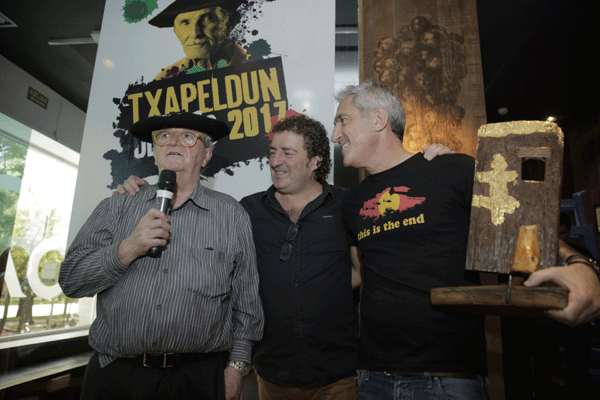 La entrega de la preciada ‘txapela’, que sólo tienen en su poder cabezas brillantes y excepcionales, ha tenido lugar por primera vez en Sagardi Castellana en un acto que ha reunido a un centenar de personas y donde no han faltado las célebres alubias de Tolosa y el tradicional Txuletón de Buey de Sagardi. Los anteriores ‘txapeldunes’ Mikel Urmeneta, creador de Kukuxumusu y ahora al mando de Katuki Saguyaki, el periodista Jon Sistiaga y Karra Elejalde, actor de la película “8 apellidos vascos” no han querido perderse este pequeño homenaje a uno de los mejores cocineros de nuestra gastronomía. ¡Todo un Txapeldun!