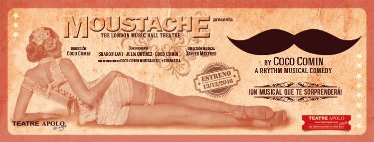Des del passat 13 de desembre el Teatre Apolo acull el musical Moustache, que narra una història inèdita, ambientada al Londres de principis del Segle XX, on el Moustache Music Hall ofereix espectacles dirigits a la classe obrera, només per cavallers amb bigoti i que té com a protagonista al Petit Max, un exitós comediant i ballarí. El musical està tenint molt d’èxit i una de les claus de l’èxit és Coco Comin, que està darrere de la història i la direcció coreogràfica. Després d’una extensa trajectòria plena d’èxits, Coco Comin s’il·lumina de felicitat per aquesta gran acollida de Moustache.