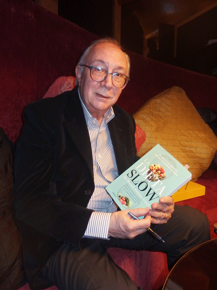 Si hablamos de dietas nutricionales para adelgazarnos hay una gran variedad: serias, extravagantes, milagrosas, serias, complicadas, sencillas y personales. En el libro en la Dieta Slow… yo he escrito otras dietas para adelgazarnos. Pero ahora estoy hablando de otra cosa y quiero salvar la diferencia. En la nutrición tiene que haber un equilibrio con la naturaleza. Actualmente tenemos una pérdida de contacto con la naturaleza, desde que empieza al día hasta el final. Respiramos una atmósfera contaminada…. Y si intentásemos algo que nos permitiese contactar con la naturaleza? Es un homenaje al movimiento del Slow Food, que nació en Italia. Su preocupación es el contacto con la naturaleza a través de la alimentación. En el libro hablo de un programa muy sano para adelgazarnos, con los elementos necesarios, donde lo podemos tomar todo, siempre con la medida justa. Crear nuevas costumbres, inventar cosas. Para ello es importante el Slow Juicer, una máquina extractora de alimentos, que viene de América. con él podemos hacer batidos útiles para la alimentación y la pulpa también la podemos aprovechar.