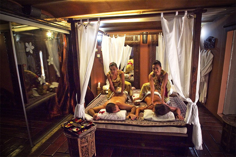 camilla especial de madera tallada por artesanos balineses. Este masaje realza la diversidad de sensaciones al mismo tiempo, lo cual redunda de forma muy positiva en