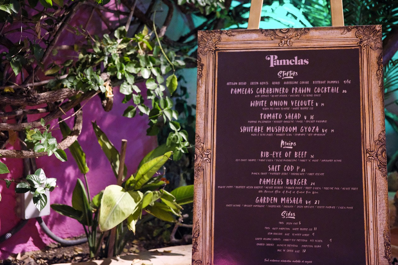 El menú se inspira en los clásicos de los años 70, con un excéntrico toque inglés y productos mediterráneos de temporada a cargo del chef galés Lee Milne. Se encontrarán delicias como el exuberante cóctel de carabineros, la hamburguesa Pamelas de Angus y encurtidos caseros, el bacalao salado con puerros con mantequilla y mejillones y la costilla de ternera con salsa de soja caramelizada y setas enoki. Durante todo el día puede disfrutarse un auténtico desayuno inglés, deliciosos sandwichs, ensaladas con ingredientes orgánicos y postres muy tentadores. El “Menú Pamelas” ofrece una degustación de los platos estrella maridado con excelentes vinos españoles y franceses. Porque el vino en Pamelas es el elixir de la felicidad.<
