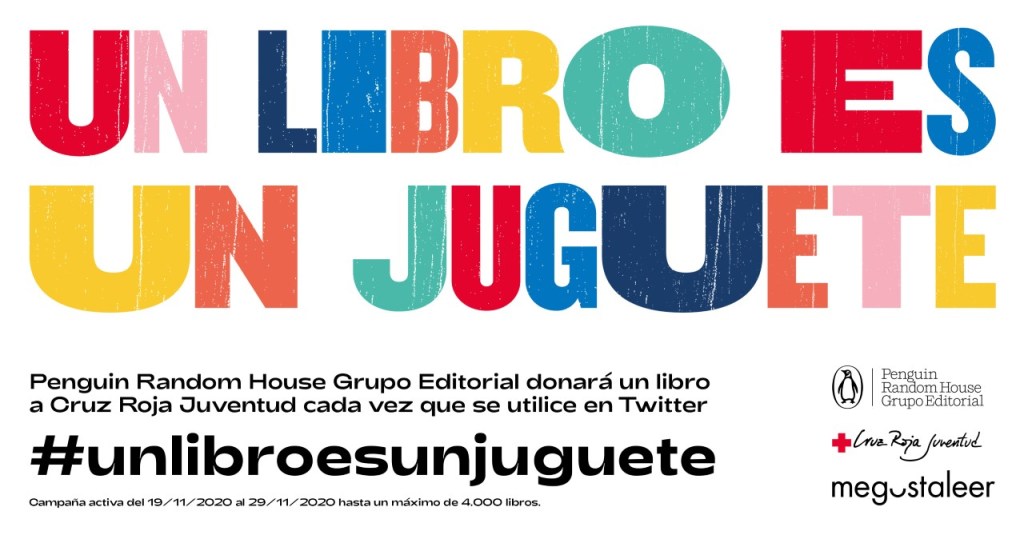 Tras el éxito obtenido en pasadas ediciones, Penguin Random House Grupo Editorial y Cruz Roja Juventud, se vuelven a unir para poner en marcha la cuarta edición de la campaña navideña #unlibroesunjuguete. Una iniciativa, en la que cualquier usuario de Twitter puede participar y que comenzará hoy, 19 de noviembre, finalizando el 29 de noviembre, momento en el que esperamos haber conseguido los tuits suficientes para poder regalar 4000 libros a estos niños.