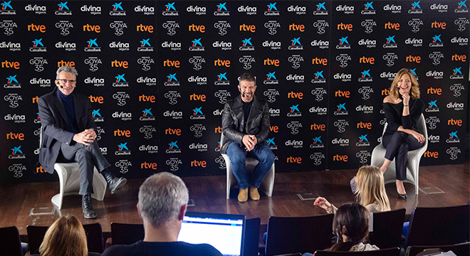A un mes para la gran noche del cine español, los presentadores de la gala, Antonio Banderas y María Casado, y el presidente de la Academia de Cine, Mariano Barroso, desvelaron este martes algunos de los detalles de la gala de los 35 Premios Goya, que se celebrará el 6 de marzo en el Teatro del Soho CaixaBank de Málaga, en un formato híbrido, con presencia únicamente de presentadores, entregadores y actuaciones musicales, debido a la evolución de la pandemia.