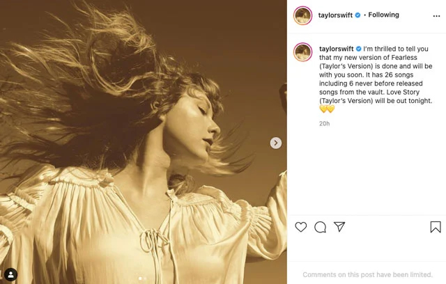 Fearless fue un álbum lleno de magia y curiosidad, la bendición y la devastación de la juventud. Era el diario de las aventuras y de las exploraciones de una adolescente que estaba aprendiendo pequeñas lecciones con cada nueva grieta en la fachada del final del cuento de hadas que había visto en las películas. Estoy entusiasmada de comunicaros que mi nueva versión de fearless está terminada y muy pronto estará con vosotros. Se llama fearless (taylor’s version) e incluye 26 canciones.