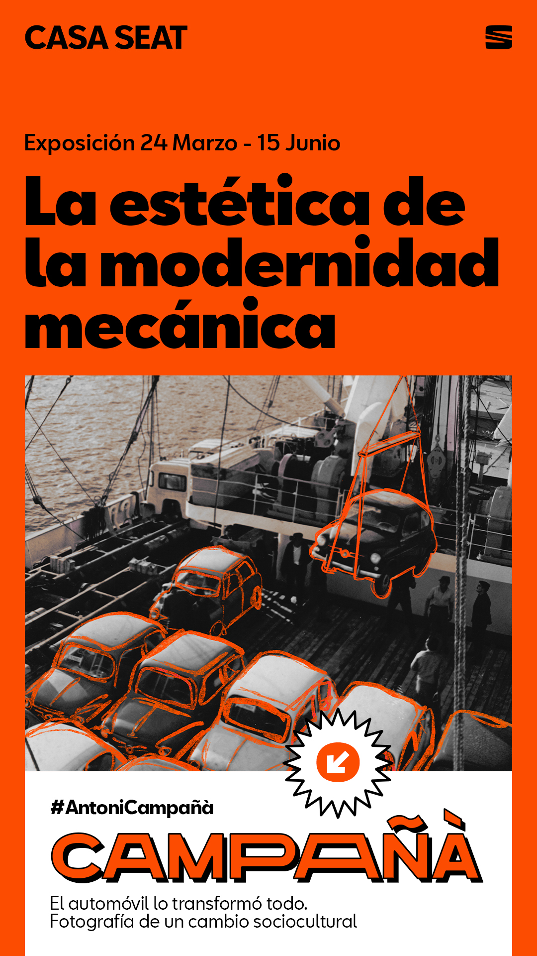 Integradas en las tres plantas de CASA SEAT y presentadas en diversos soportes —tales como impresiones de gran formato, proyecciones audiovisuales o negativos retroiluminados, entre otros— las imágenes que componen Campañà. La estética de la modernidad mecánica ofrecerán a los visitantes una reflexión acerca de la evolución del espacio urbano, la irrupción de la velocidad o la posibilidad de belleza en los entornos industriales a través de la mirada única de uno de los grandes fotógrafos catalanes y españoles del siglo XX. La exposición presenta además las fotografías de una manera dinámica e innovadora. En la planta 1, por ejemplo, los visitantes podrán seguir el viaje fotográfico por Europa que Campañà realizó a bordo de un SEAT 600 mediante una pantalla interactiva. Para la ocasión se instalará además un auténtico 600 restaurado por los profesionales de SEAT Coches Históricos con el que los visitantes podrán constatar cómo ha evolucionado la movilidad en los 70 años de historia de la compañía.