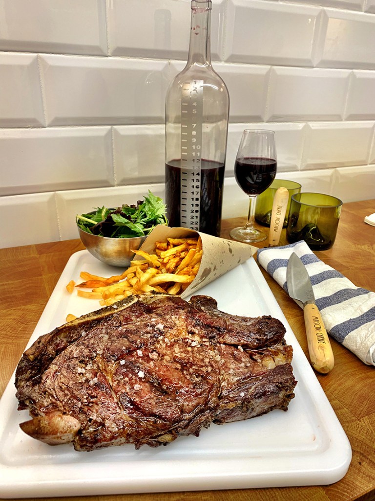 El auténtico Chuletón de 1kg de Maison Carne para 1 o 2 personas a compartir se ofrece por un precio único de 29€, que incluye sus famosas patatas fritas caseras y el tradicional Paté de Cabanes producido artesanalmente en Douzens. Además, podrás disfrutar de una degustación de cinco variedades de quesos con un método de pago marcado por el peso-consumo de cada cliente. También te ofrece una variada carta de vinos tintos, blancos, rosados y espumosos para los paladares más selectos, además del vino de la casa producido por la cave Coopérative d’Embres et Castelmaure con D.O AOC y servido en una botella Magnum de 24 cm donde cada centímetro consumido tiene un precio de 1€.
