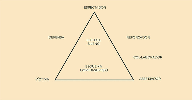 Els participants de tota situació d’assetjament són tres: els assetjadors, la víctima i els espectadors. Es tracta del denominat ‘Triangle del Bullying’. En un dels vèrtexs, estan posicionats els espectadors, aquests tenen tres formes possibles d’acció: activa agressiva, en la qual fan costat a l’assetjador i es converteixen en els seus còmplices (animen, graven les agressions…); passiva, on opten per no entremetre’s en aquesta situació d’assetjament malgrat ser conscients del que succeeix -aquesta opció pot donar-se per indiferència o per por de convertir-se en víctimes si decideixen actuar; i finalment, activa defensiva, que és en l’ÚNICA posició on s’ajuda a la víctima –en aquest cas, els espectadors opten per ajudar-la, ja sigui enfrontant-se a l’agressor o demanant ajuda en el seu nom.