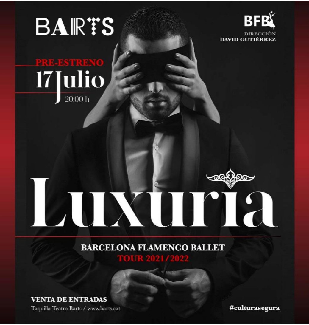 La Compañía Internacional Barcelona Flamenco Ballet, pre-estrena el 17 de julio de 2021 a las 20:00h en el Teatro Barts de Barcelona su nuevo espectáculo ‘Luxurîa’ bajo la dirección de David Gutiérrez. Barcelona Flamenco Ballet se consolida como una de las compañías de danza de referencia mundial, y reconocida internacionalmente tras sus éxitos en la cartelera de los mejores teatros del mundo en países como China, Estados Unidos, Letonia, Líbano, Armenia, Serbia, y España, con sus anteriores espectáculos ‘Tiempo Nuevo’ y ‘Atrapado en el Tiempo’.