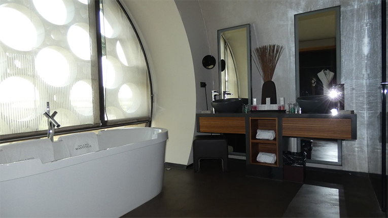 Un hotel de lujo 5 estrellas que por su peculiar diseño el edificio adopta la ondulación de un apilamiento de botellas con ventanas celosías que imitan a las burbujas chispeantes del cava y una cubierta de trencadís que recuerda, sin disimulo, a las construcciones de Gaudí en la capital catalana. Obra del arquitecto Josep Juanpere y su estudio GCA Arquitectes, asiduos al diseño de los hoteles Meliá, este vistoso proyecto consigue llamar la atención.Todas las habitaciones están denominadas por una variedad de uva ,Dos amplias botellas de cava se unen para proporcionarte la mejor habitación del hotel. La suite MasTinell dispone de espectaculares vistas panorámica a los viñedos y múltiples detalles para que vivas la magia del cava, como nunca antes la habías vivido. Sin desmerecer el resto de habitaciones del primer Cava&Hotel de Catalunya .