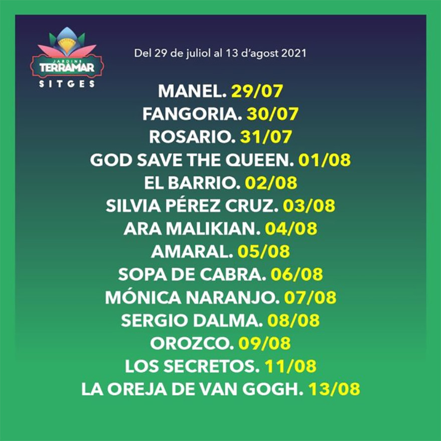 El 5 d’agost, Amaral, una de les bandes de major èxit del pop espanyol de les últimes dècades, recupera la seva gira Salto al Color amb una imponent escenografia per recorre els principals escenaris del país i fa escala als Jardins de Terramar, on ressonaran hits com Sin ti no soy nada o Cómo hablar. Un dia més tard, el 6 d’agost, tindrem l’oportunitat de veure Sopa de Cabra amb la gira que commemora el 30è aniversari del seu mític treball Ben endins. El 7 d’agost, Mónica Naranjo amb el seu intimista Puro Minage, i acompanyada únicament per un piano, celebra el 20è aniversari de la publicació de l’àlbum Minage que va significar la seva consagració. Un dia després, el 8 d’agost, Sergio Dalma imprimirà un aire renovat als seus clàssics més rotunds des d’una nova perspectiva per festejar tres dècades dalt dels escenaris amb la Gira 30… y tanto.