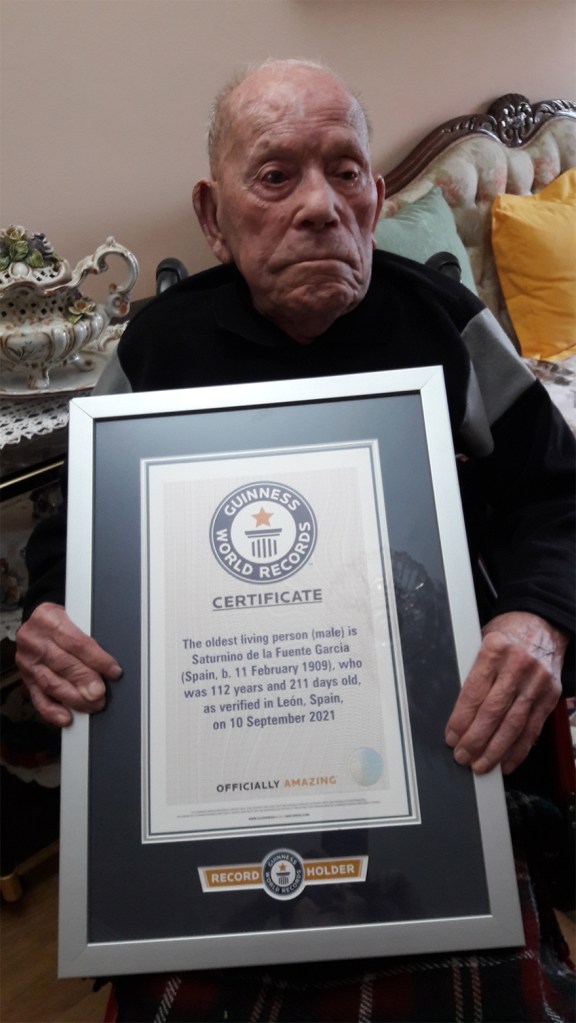 A menos de una semana del lanzamiento de la nueva edición del Libro Guinness de los Récords, un nuevo español se cuela en el anuario más esperado. Guinness World Record, la autoridad mundial en materia de récords, anuncia hoy que el leonés Saturnino de la Fuente García, es la persona viva más longeva (género hombre) con 112 años y 211 días desde su certificación oficial el pasado 10 de septiembre de 2021.