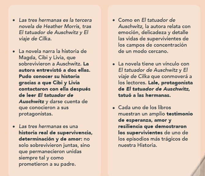 El libro surgió después de que Livia, una de las hermanas protagonistas de Las tres hermanas, conociese la historia de El tatuador de Auschwitz. En ese momento se dio cuenta de que ella conoció a la mujer de la que el protagonista, Lale, hablaba en el libro. De hecho, aquella joven, Gita, era del mismo pueblo que Livia en Eslovaquia, donde fueron al colegio juntas. También coincidieron en Auschwitz-Birkenau. A partir de ahí las dos historias se conectaron, y Heather Morris supo que debía contar la experiencia de esas tres hermanas que sobrevivieron juntas al peor de los horrores.