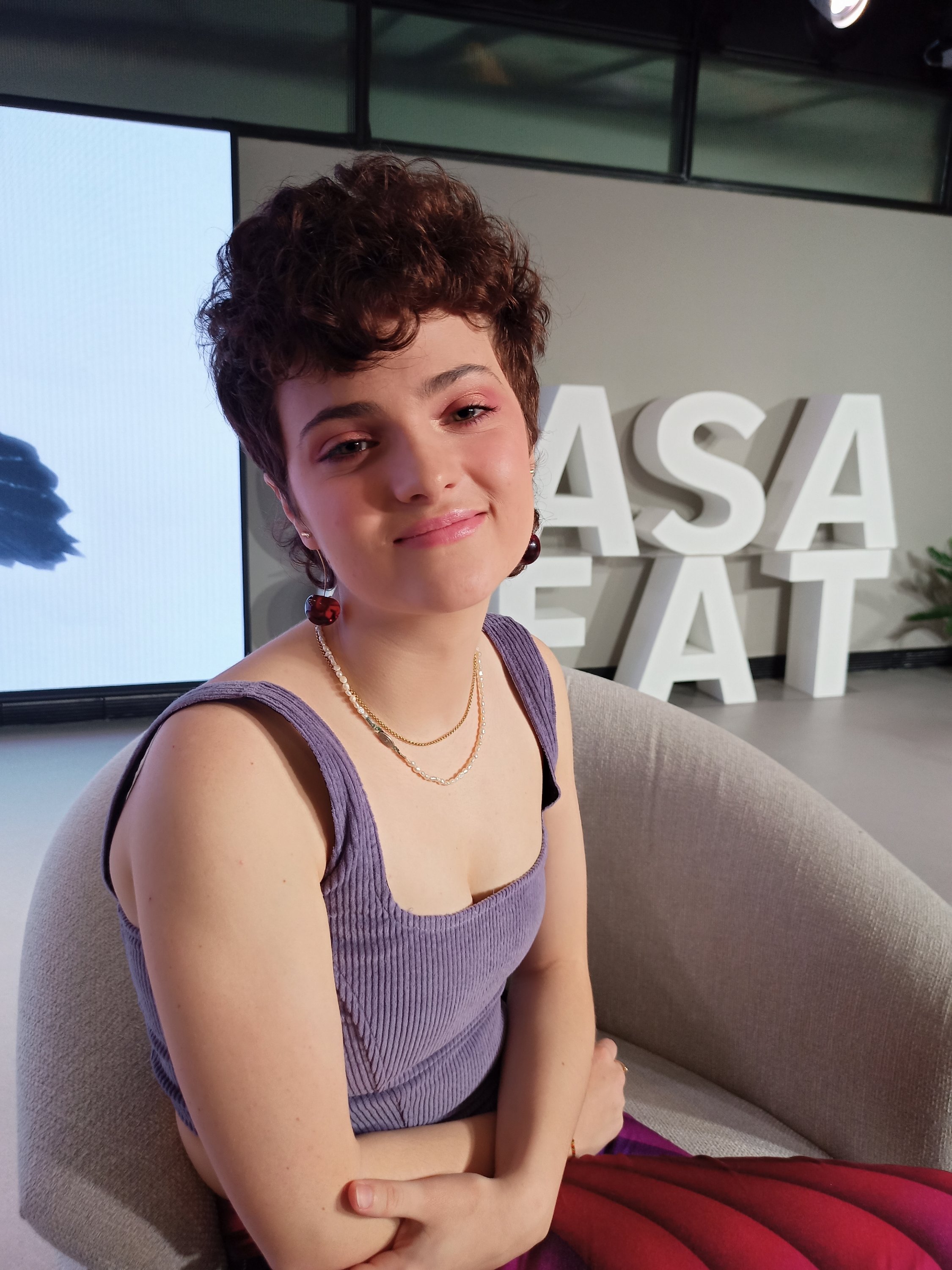 Me siento todo el rato en continuo cambio y crecimiento, y sí que me siento pequeña, eh, y lo sigo siendo en realidad. (Se lamenta por no haberse despedido de alguien que marcha de la sala, le decimos ‘Pues corre’, pero ella decide continuar con la entrevista. Interpretamos esto como parte de su crecimiento. Y continúa respondiendo la pregunta:) Lo que contaba antes, que no me siento identificada con esta imagen que se tiene de mi, pero a la vez sí que me sigo sintiendo ‘un moco’ muchas veces y de eso trata un poco la canción, de vencer este ‘síndrome de la impostora’ y estos miedos.