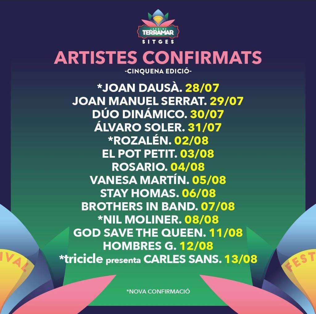 El cantautor Joan Dausà oferirà el 28 de juliol el concert inaugural, presentant les noves cançons del seu darrer treball “Ho Tenim Tot”. Una altra de les veus més rellevants dels últims temps, Rozalén, s’afegeix a la programació del festival el 2 d’agost, en un any que combina escenaris a banda i banda de l’oceà amb la seva exitosa gira “El Árbol y el Bosque”. La tercera data que se suma al festival és el 8 d’agost, amb un dels artistes del moment, Nil Moliner, que acaba de posar en marxa “Nuestra Locura Tour”. I el 13 d’agost, Tricicle presenta Carles Sans a “Per Fi Sol!”, el monòleg del segell La Casa de la Risa, el cicle de comèdia del Grup Balañà que reuneix els millors còmics del panorama nacional arriba a Sitges per cloure la cinquena edició del festival d’una manera original i divertida.