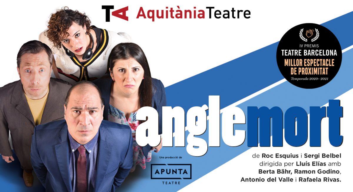 A partir del proper 26 d’abril, a l’escenari de l’Aquitània Teatre es podrà veure la comèdia ‘Angle Mort’, un text de Sergi Belbel i Roc Esquis, amb direcció de Lluis Elías, que va ser Premi Teatre Barcelona a Millor Espectacle de Proximitat en la seva quarta edició.