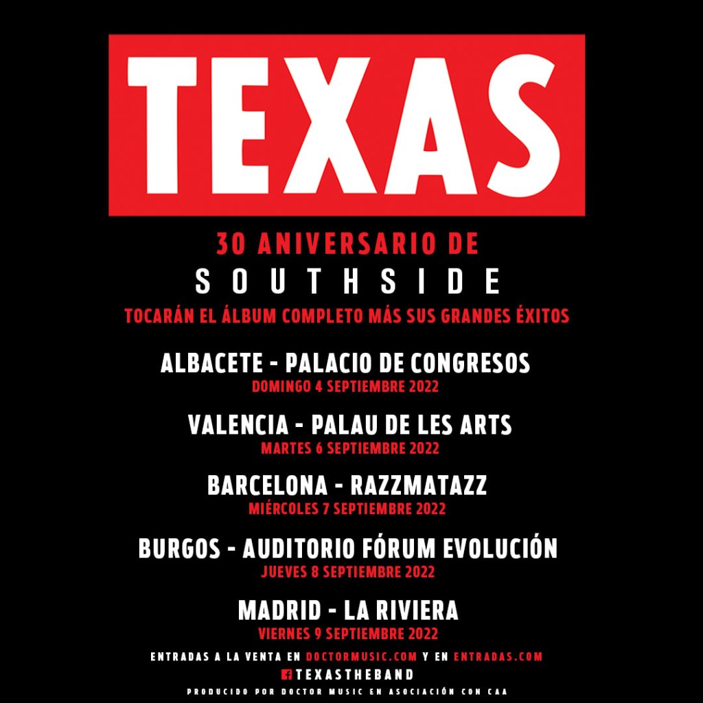 Tras el éxito de su anterior gira, que coincidió con la salida de su último álbum, Jump On Board, Texas vuelve ahora a los escenarios para conmemorar el 30 Aniversario de su álbum debut, Southside. En esta gira nos espera un espectáculo donde no faltará ninguno de los temas que forman parte de este mítico trabajo, además de contar con todos sus grandes éxitos. Sin duda lo de Texas es una carrera de fondo seguida de cerca por una legión de fans que los ha acompañado y ha crecido con ellos.