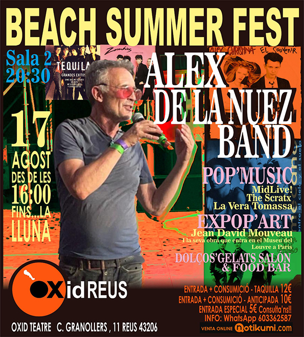 El gran nombre del cartel es Alex de la Nuez, músico, compositor y arreglista desde los años ochenta de bandas tan míticas como Zombies, Tequila o Mecano que alcanzó la fama y el éxito gracias a su duo con Christina Rosenvinge: Alex y Christina. También ha ejercido como productor de grupos como Azúcar Moreno y Objetivo Birmania. Ya en solitario obtuvo su mayor éxito con “Dame más”, (versión de un tema de Steve Miller Band) que fue número 1 en España. Alex vuelve a los escenarios en BEACH SUMMER FEST para tocar en vivo una mezcla de temas inéditos con los grandes éxitos de los grupos en los que ha participado. Su nueva banda está formada por Óscar Colomina al bajo, Patty García, voz y coros, Óscar González, teclados y Enric Álvarez en la batería.