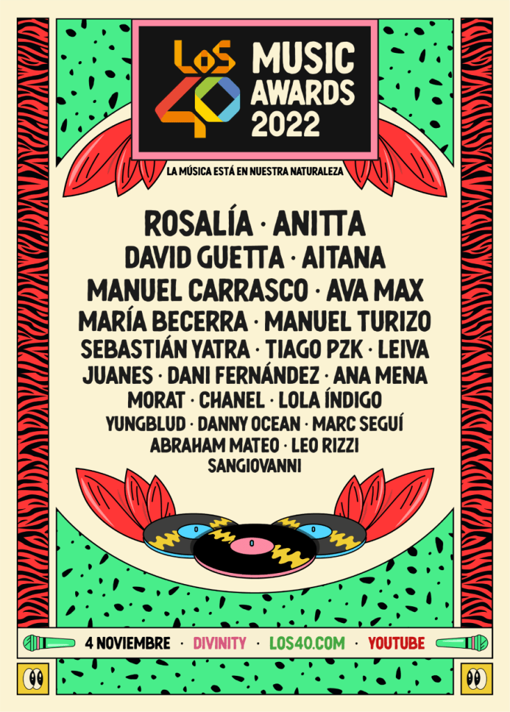Rosalía, Anitta, David Guetta, Manuel Carrasco, Aitana y Ava Max encabezan el cartel de LOS40 MUSIC AWARDS 2022 junto a María Becerra, Manuel Turizo, Sebastián Yatra, Tiago PZK, Leiva, Juanes, Dani Fernández, Ana Mena, Morat, Chanel y Lola Índigo. Sobre los tres espectaculares escenarios actuarán también Yungblud, Danny Ocean, Marc Seguí, Abraham Mateo, Leo Rizzi y Sangiovanni. En total, más de 20 actuaciones pondrán música a la edición más salvaje de la historia de los premios.