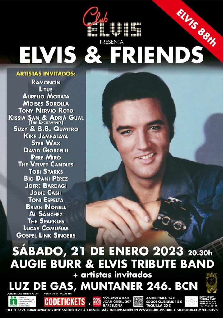 El próximo 21 de enero vuelve el concierto benéfico que se ha convertido en toda una tradición cada año en Barcelona: Elvis & Friends. El Club de Fans oficial de Elvis celebrará en la sala Luz de Gas el que hubiera sido el 88º aniversario del Rey del Rock, con un concierto muy especial a cargo de Augie Burr & Elvis Tribute Band (ETB).