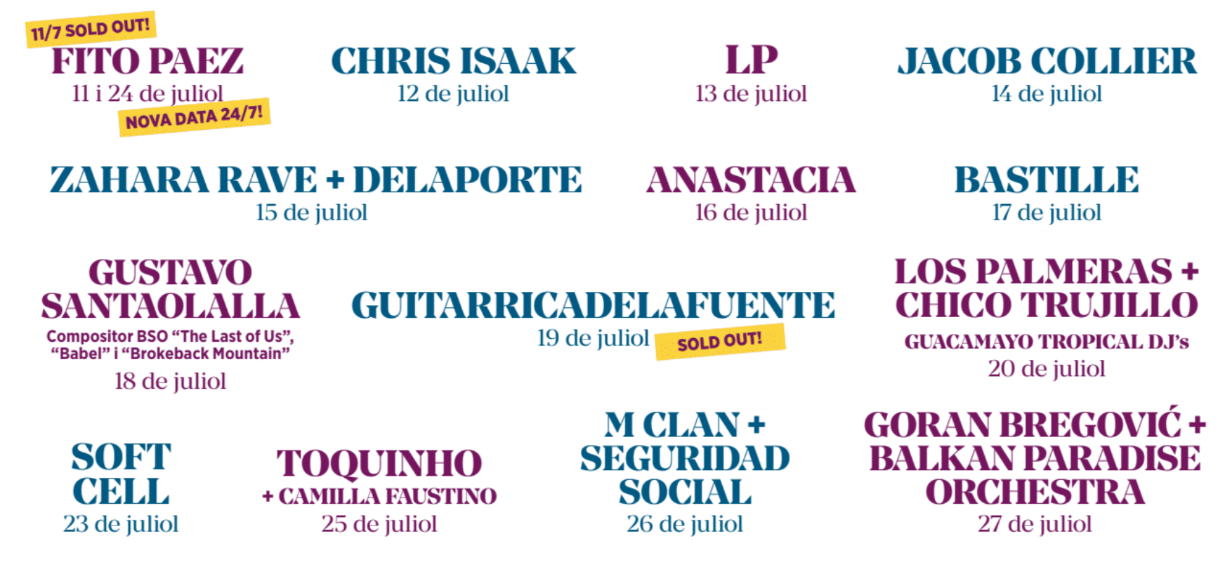 El festival contará con reconocidos artistas y talentos nacionales e internacionales para ofrecer una experiencia única como Anastacia, Fito Paez, Chris Isaak, Bastille, Guitarricadelafuente, LP, Jacob Collier o Soft Cell. Dos de los conciertos de esta edición ya ha anunciando el sold out: Fito Paez, que realizará un segundo concierto el 24 de julio, y Guitarricadelafuente.