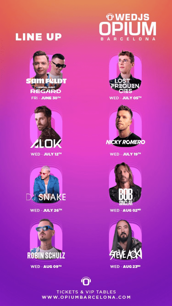 Para abrir boca en el opening Sam Feldt, un talento del pop más adictivo y veraniego. Lost Frequencies traerá su deep house, considerado por muchos como el sonido del futuro. Tras él Alok, gran triunfador en las noches de Ibiza, mostrará porque es la gran revelación americana del house y número 4 del mundo. Nicky Romero siempre cumplidor y sin bajar de la élite en años vuelve a su casa unos días más tarde, dando paso una semana después al sensual y oscuro Dj Snake y el siempre bienvenido french touch y sexy chic de Bob Sinclar. En la recta final llegarán el rey del electro, el alemán Robin Shulzt y el entrañable y salvaje de origen asiático Steve Aoki, tan célebre por su garra como por las tartas que lanza al público .