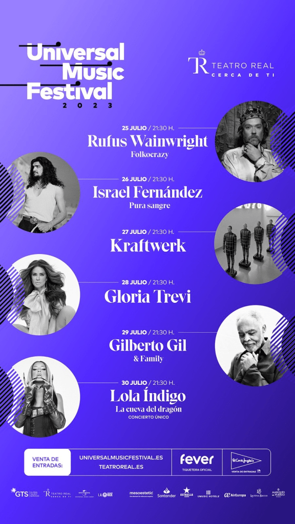 Al soberbio programa de actuaciones –que conjuga la presencia de figuras míticas de calado internacional y estrellas de la música más actual en España entre las que se encuentran Rufus Wainwright, Israel Fernández, Kraftwerk, Gloria Trevi o Gilberto Gil – se suma el activo profesional técnico y escenográfico del Teatro Real de Madrid, que sigue acogiendo un festival que ha adquirido ya marchamo de clásico. Universal Music Festival 2023 nos ofrece en su séptima edición un menú de música en vivo de carácter heterogéneo donde el eclecticismo y la calidad son elementos indiscutibles. El festival se ha asentado ya como una de las citas más importantes del verano, y con esta nueva edición renueva la confianza del público más exigente.