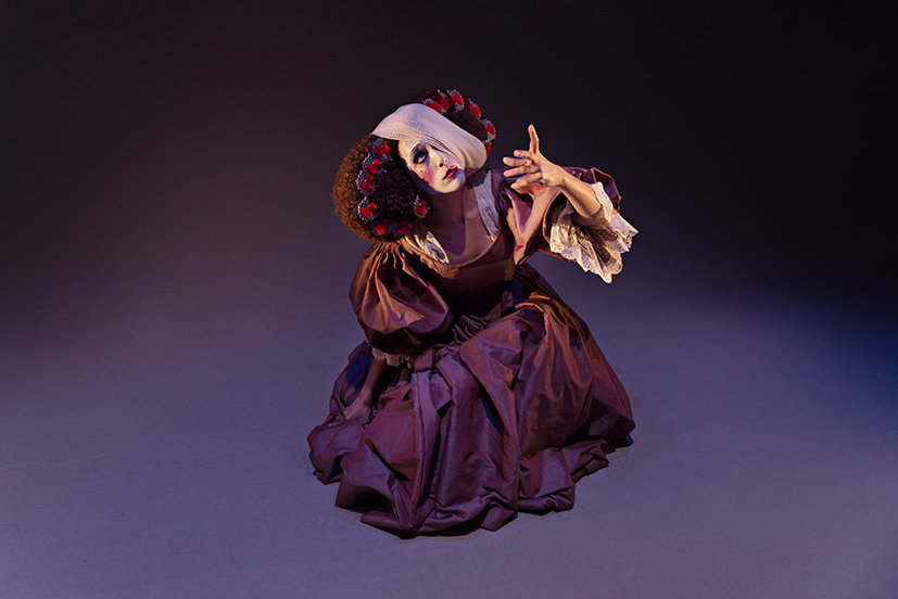 Encarna múltiples personajes sin ningún objeto en la escena más que una venda y un lienzo blanco. Una