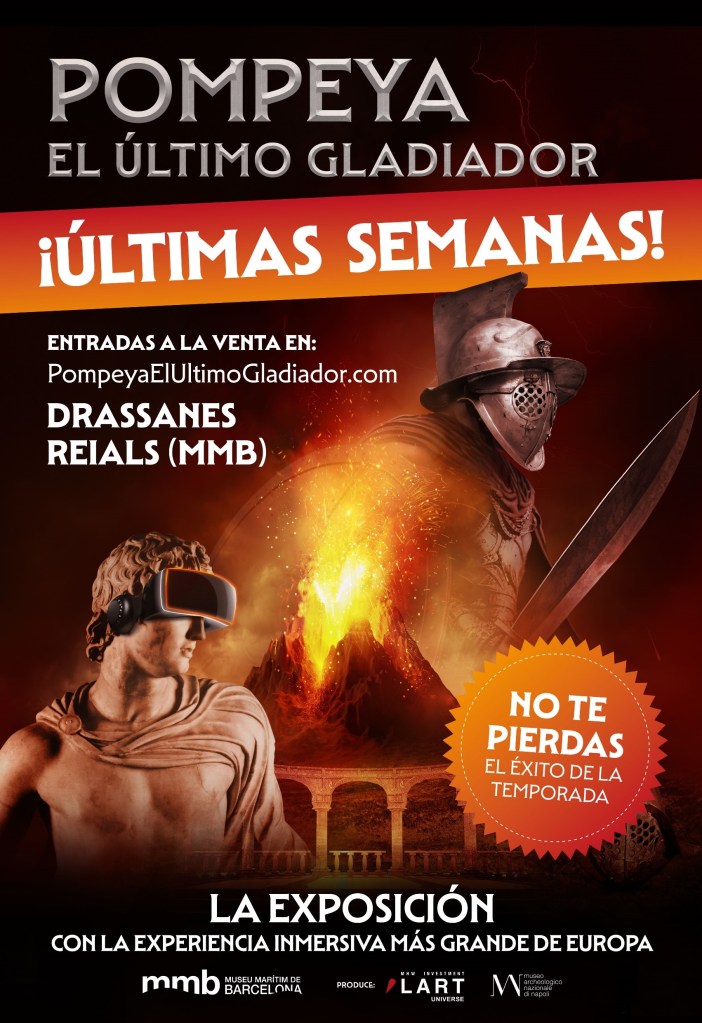Las Drassanes Reials de Barcelona acoge hasta al 15 de octubre la exposición POMPEYA. EL ÚLTIMO GLADIADOR, en primicia mundial la muestra exhibe 150 piezas originales procedentes de la colección permanente del Museo Arqueológico Nacional de Nápoles. La siguiente parada de esta exposición que ha tenido un gran éxito es Múnich (Alemania).