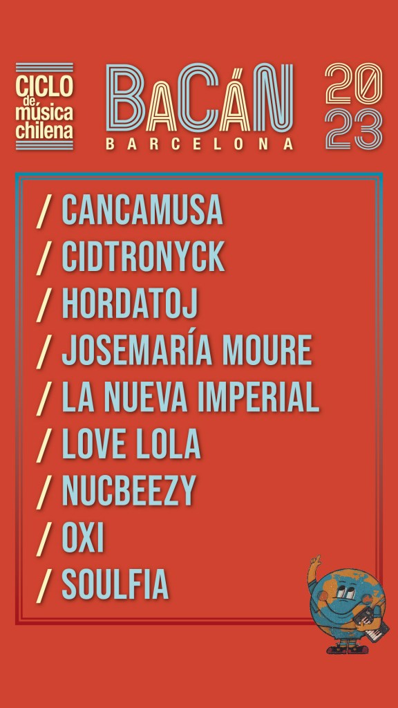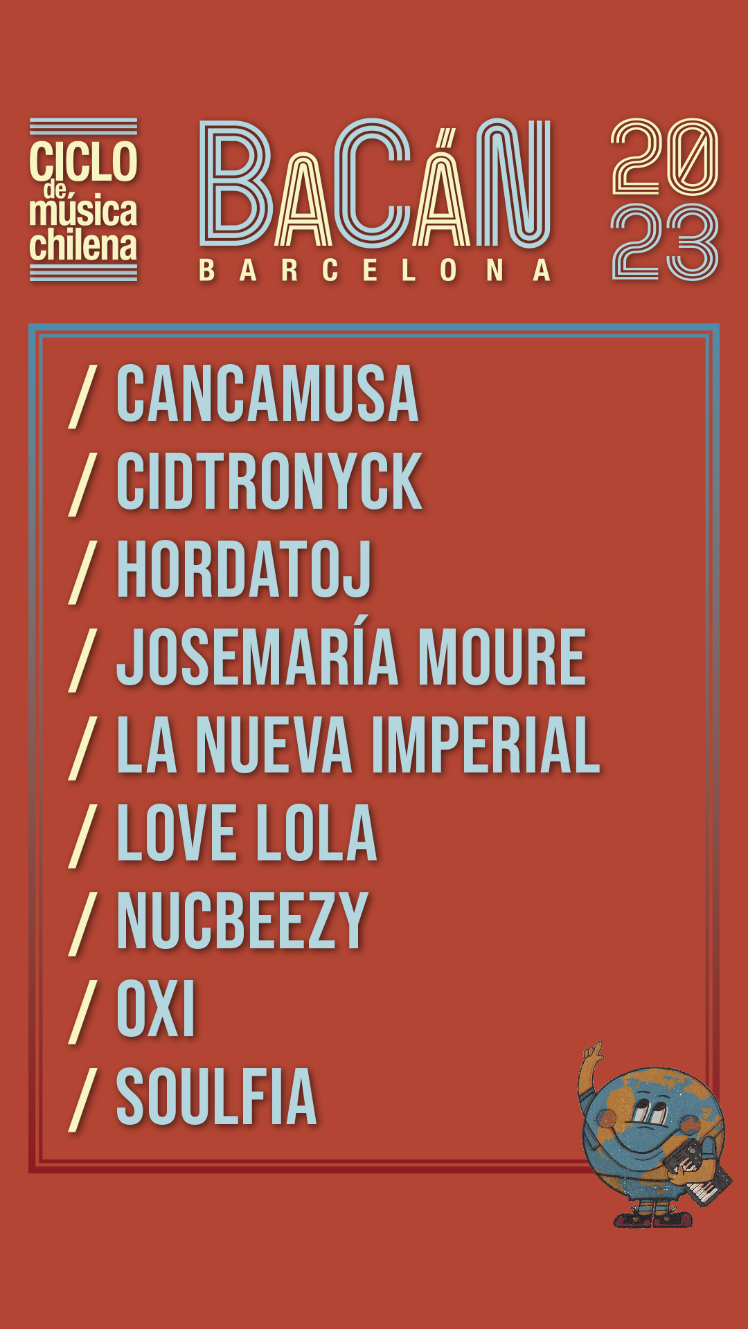 De esta manera, Ciclo BaCáN vuelve a entregar una programación con distintos estilos, en 5 fechas durante octubre y noviembre. Cabe destacar que los conciertos comenzaron el pasado 23 de septiembre con el cantautor chileno residente en Barcelona Josemaría Moure. La sala New Fizz fue testigo de una noche llena de canciones y emociones, donde el músico y multi instrumentista presentó su último disco “Desarraigo” (2023) con varios artistas invitados, entre ellos, el cantante y compositor Diego Lorenzini quién colabora en su canción “Cómo una Fogata”.