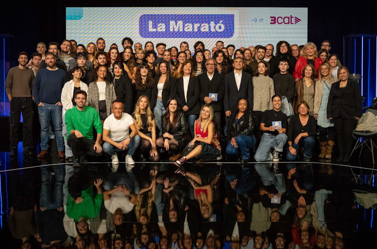 Una foto amb tots els músics, cantants, formacions i equips que han participat en l’elaboració del disc ha posat punt final a una presentació solidària i emotiva, que avança en la campanya de divulgació i sensibilització de La Marató 2023.
