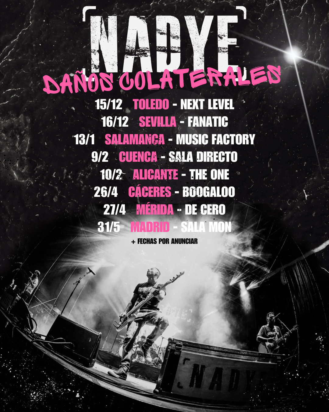 Nadye es una banda madrileña con tres discos y más de 500 conciertos a sus espaldas. Tras dos discos autoeditados, su último trabajo «Intrapolar» (Warner Music) consigue una gran acogida de crítica y público y los lleva a realizar una extensa gira de más de un centenar de fechas por salas, fiestas y festivales de todo el país que culminaría en una Sala Mon en Madrid llena hasta la bandera.