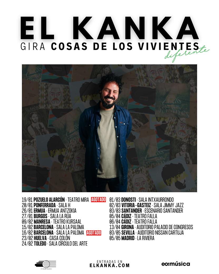 La primera de las citas de «Cosas de los vivientes – Diferente» será el 19 de enero en Pozuelo de Alarcón (Teatro Mira) con las entradas agotadas. Luego seguirá el 20 de enero en Ponferrada (Sala H); 26 de enero en Ermua (Ermua Antzokia); 27 de enero en Burgos (Sala La Rúa); 9 de febrero en Manresa (Teatro Kursaal); 15 y 16 de febrero en Barcelona (Sala La Paloma) con las entradas para el segundo día agotadas; 23 de febrero en Huelva (Casa Colón); 24 de febrero en Toledo (Sala Círculo del Arte); 1 de marzo en Donosti (Sala Intxaurrondo); 2 de marzo en Vitoria Gasteiz (Sala Jimmy Jazz); 3 de marzo en Santander (Escenario Santander); 5 y 6 de abril en Cádiz (Teatro Falla); 13 de abril en Girona (Auditorio Palacio de Congresos); 3 de mayo en Sevilla (Auditorio Nissan Cartuja); y el último concierto el 5 de mayo en Madrid (La Riviera). Las entradas están disponibles en www.elkanka.com.