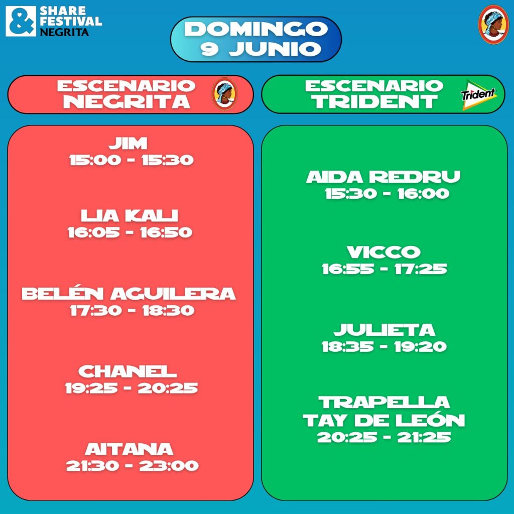 Así pues, el viernes 7 de junio el pistoletazo de salida lo dará Mama Dousha desde el Escenario Negrita al que seguirán las actuaciones de Ptazeta, Jhayco y del puertorriqueño Mike Towers. Mientras que en el Escenario Trident se irán sucediendo las de Nàtura, Sujaila, Maikel Delacalle, Cali y el Dandee y Juan Magán. La jornada tocará a su fin en el escenario Negrita con la actuación de Lola Índigo, una de las figuras más reconocidas de la música española actual, que destaca por su versatilidad artística y su capacidad para fusionar distintos géneros musicales.