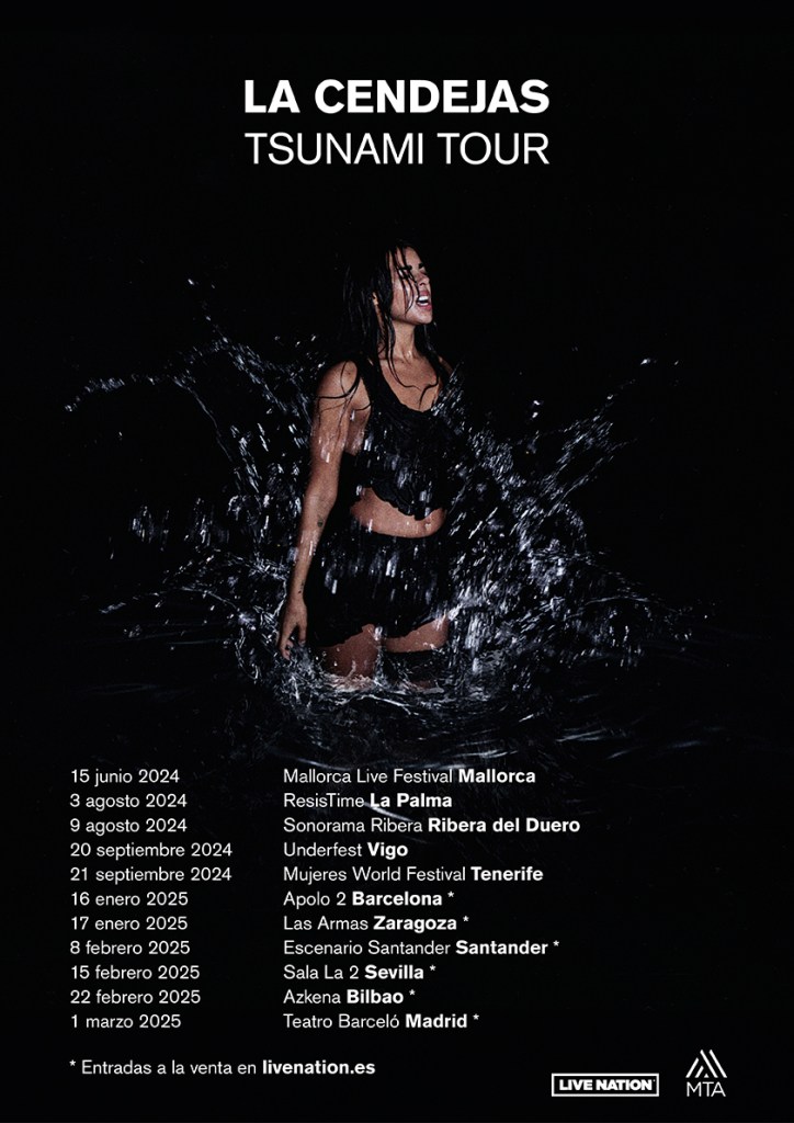 La Cendejas, artista y compositora madrileña, anuncia hoy nuevas fechas dentro de TSUNAMI TOUR en 2025. Además de su participación en festivales este verano, la artista actuará en las principales ciudades del país el próximo año: el 16 de enero estará en la sala Apolo 2 de Barcelona, el 17 de enero en Las Armas de Zaragoza, el 8 de febrero en el Escenario Santander de Santander, el 15 de febrero en Sala La 2 de Sevilla, el 22 de febrero en Azkena de Bilbao y el 1 de marzo en el Teatro Barceló de Madrid.