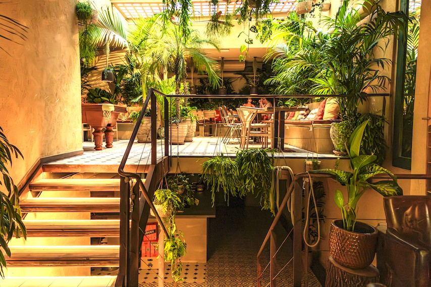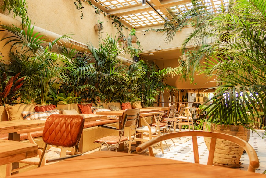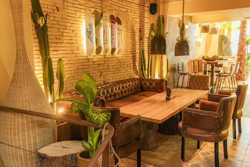 El local de 500 m2, con una ubicación privilegiada, tiene tres plantas y llama la atención especialmente por su decoración de selvática vegetación a la que le da vida y luz natural una gran claraboya, además de guiños y elementos playeros como unos columpios balineses o tablas de surf y skate, acompañados de materiales naturales como la madera y el cuero.