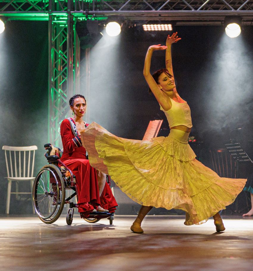 Con una dramaturgia valiente, el espectáculo profundiza en la dicotomía de la persona de Kahlo explorando el contraste entre la presentación exterior y las luchas interiores. Y lo hace dividiendo el artista en dos Fridas: una que estima la vida, llena de alegría, con colores brillantes y lejos del dolor, y la otra que es derrotada una y otra vez, por una profunda tristeza y las luchas de la vida. Las dos bailarinas de Frida, Lara Brandi y Alice Amorotti, encarnan tanto la fuerza como la vulnerabilidad del artista, creando una narración visual que refleja la complejidad de su vida e intenta capturar la esencia de la visión del mundo única de Frida Kahlo.
