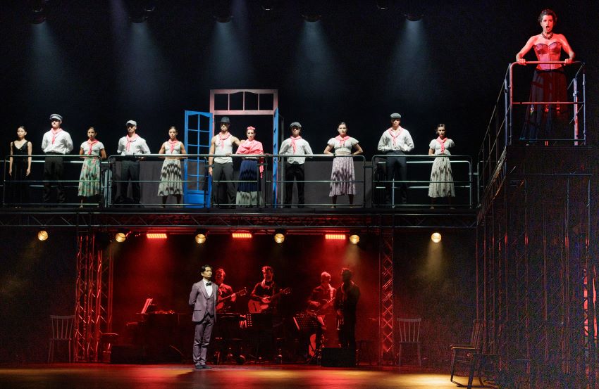 La música, a diferencia otras producciones similares, aquí es en directo, y se convierte en un viaje sonoro a través de boleros antiguos arreglados (entre los cuales destacan La Llorona, Paloma Negra y Volver Volver), tangos y canciones populares mexicanas, que se acompañan de nuevas composiciones originales del director musical de la pieza, Roberto Tubaro.