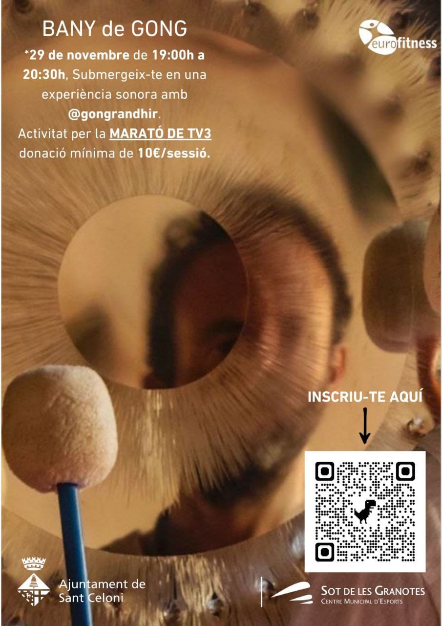 Jorge Randhir con la colaboración de Henar Jiménez con su violín se unen para la MARATÓ de TV3 con un BAÑO DE GONGS : una meditación sonora que utiliza las vibraciones y frecuencias del gong para inducir un estado de relajación profunda, liberando el estrés y revitalizando cuerpo y mente. Esta actividad se celebrará mañana viernes 29 de noviembre, de 19h a 20’30h en el Centre Municipal d’ Esports Sot de Les Granotes. Donación mínima: 10 euros.