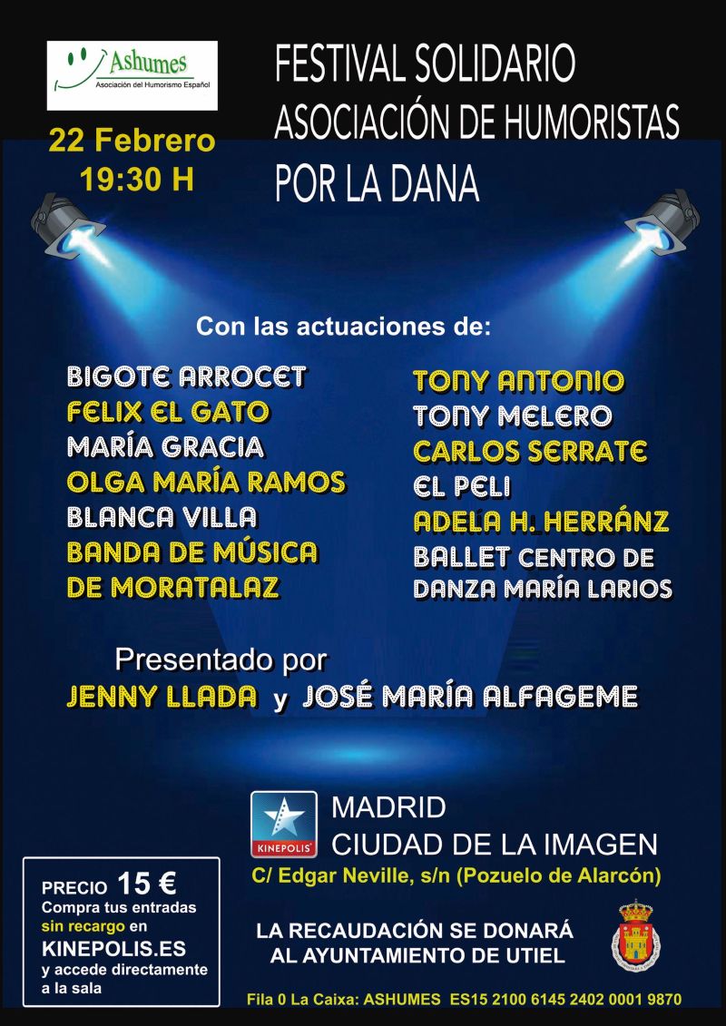 LA ASOCIACIÓN DEL HUMORISMO ESPAÑOL(ASHUMES) organiza un gran festival solidario para recaudar fondos en apoyo a los afectados por la DANA en Valencia. El evento se celebrará el próximo sábado 22 de Febrero a las 19:30 horas en KINEPOLIS-MADRID CIUDAD DE LA IMAGEN y contará con la participación de reconocidos humoristas y artistas del panorama nacional.