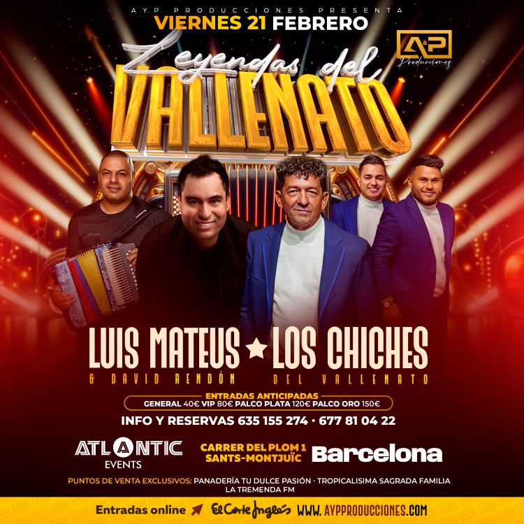 ¡Amantes del vallenato en Barcelona! Prepárate para recibir a los Chiches del Vallenato junto a Luis Mateus & David Rendón, este próximo viernes 21 de febrero en La Sala Atlantic cantando a todo pulmón sus éxitos. Las Leyendas del Vallenato en Barcelona, compra tus entradas en aypproducciones.com